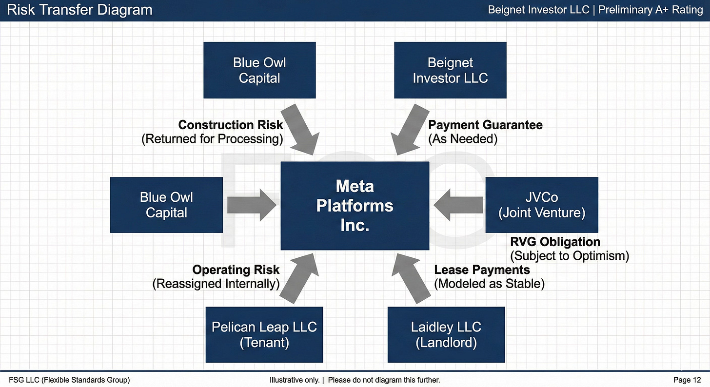 The preliminary A+ rating reflects our view that this is functionally Meta borrowing $27.30 billion for a campus no one else will touch, packaged in legal formality precise enough to satisfy the letter of consolidation rules and absurd enough to insult the spirit.